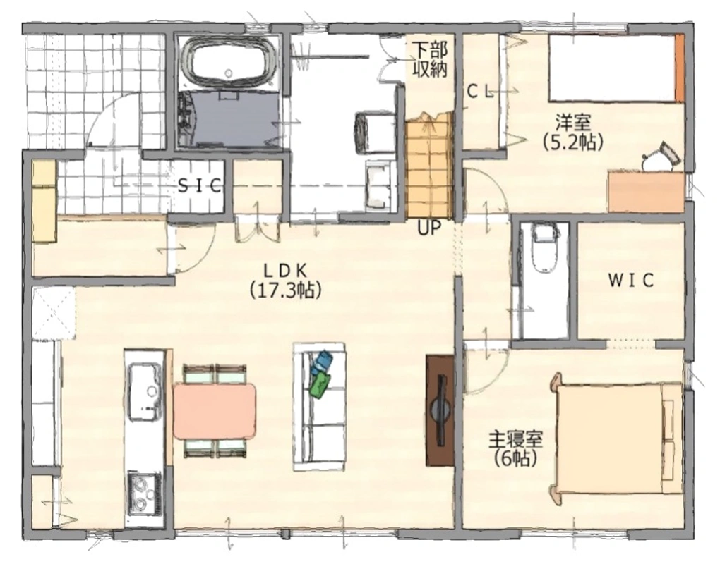 大屋根を活かした小屋裏空間が魅力の、シンプルで上質な住まい。屋根裏部屋は子供部屋や趣味、仕事部屋など、ライフステージに合わせて多目的に活用できます。また、3帖の広々とした室内干し対応洗面室や大型WICなど、家事を楽にする機能的な収納も充実。家族が同じ空間に居ながら、それぞれが思い思いに好きな時間を過ごせる、コンパクトながらもゆとりあるプランです。