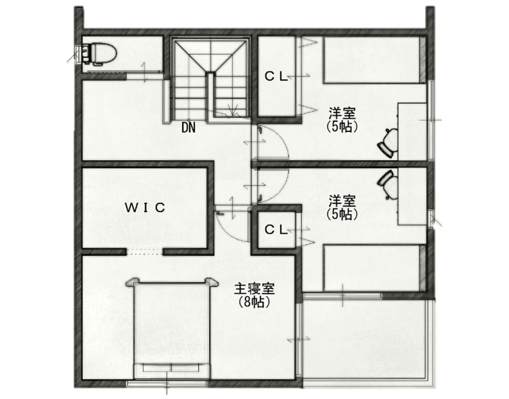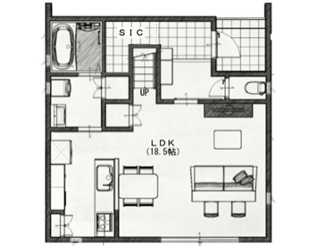 趣味を存分に楽しめる広々としたリビングは、家族が同じ空間で自由に過ごせる住まいの中心。キッチンから水回りへ直通できるスムーズな家事動線や、趣味に没頭できるフリースペースが日々の暮らしを彩ります。さらに、子供の成長に合わせて間取りを変えられるフリーウォールも採用。ゆとりのあるバルコニーや大型WICも備え、将来の変化にも柔軟に対応できる安心のプランです。