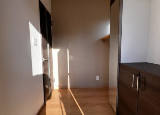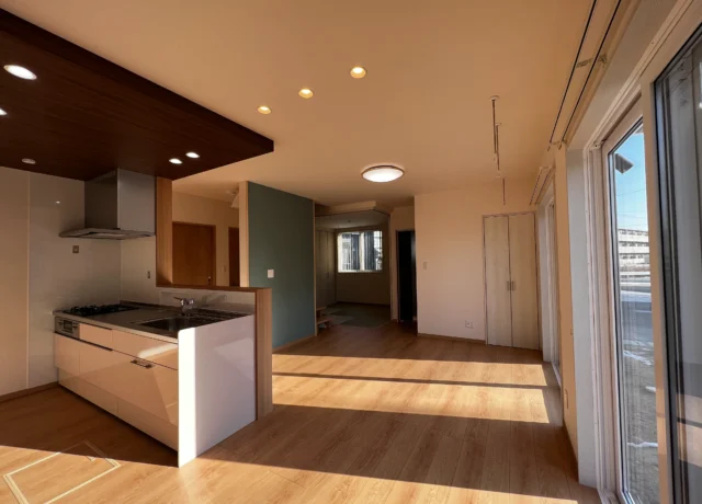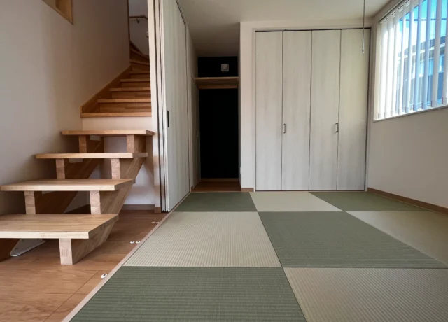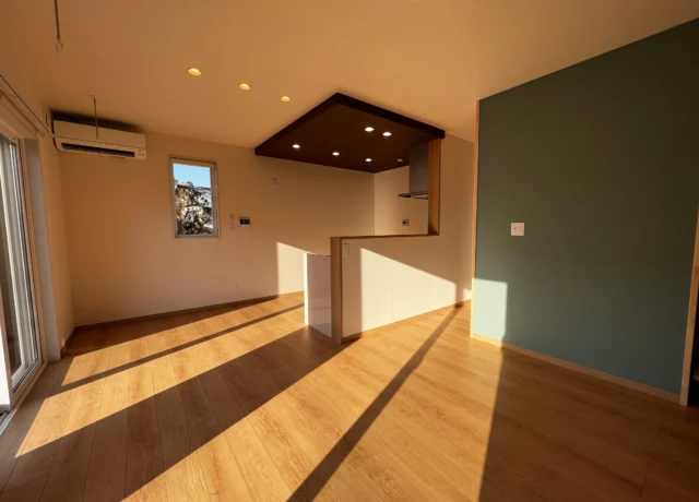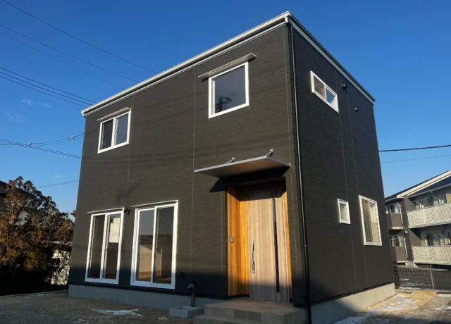 無駄を削ぎ落としたキュービックな形状に、大きな窓からたっぷりと光が差し込む設計。玄関上の横長窓は、プライバシーを守りながら室内に明るい光を届けます。コンパクトなサイズ感ながら、素材の質感にこだわることで高級感のある佇まいに。子育て世代にも人気の、メンテナンス性とデザイン性を兼ね備えた一棟です。
